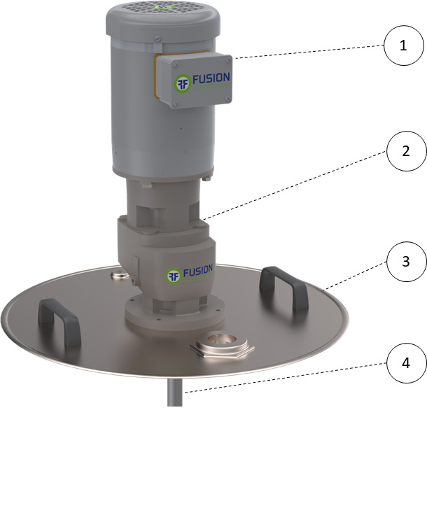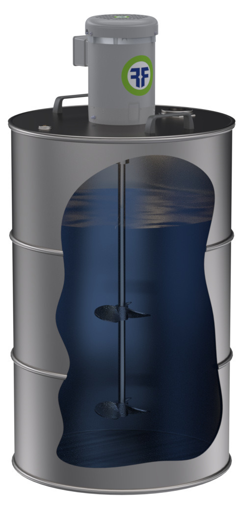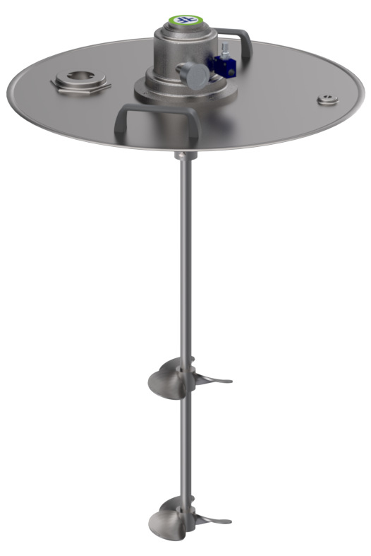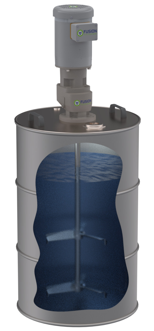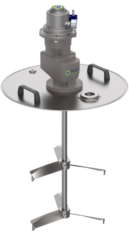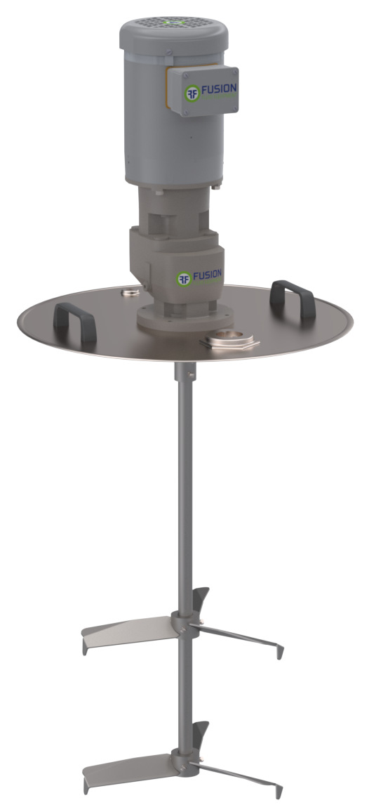 Lid mount mixers are a light weight, versatile design perfect for small batch, bulk, processing in standard 55-gallon drums or barrels. Lid mount mixers make switching containers quick and simple with the motors directly attached to the lid. Various motors (based on size, phase, and energization requirements) and gear drives, provide a wide range of fitting applications for the mixer. A single or dual 316 stainless-steel impellers are attached to a 316 stainless-steel shaft. Typical impeller choices marine prop and hydrofoil style, with options for any Fusion impeller designs. Lid mounts are 304SS with composite handles.