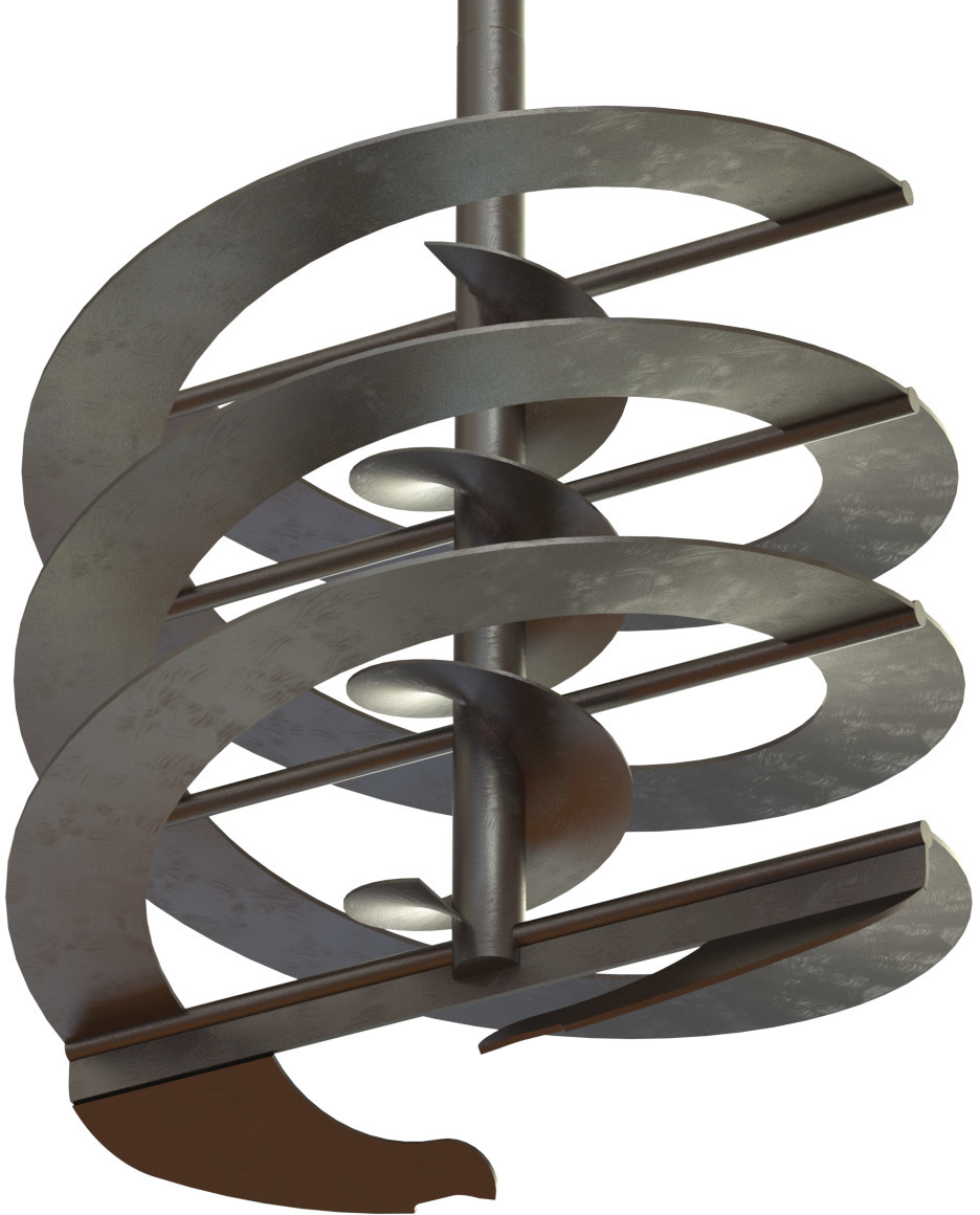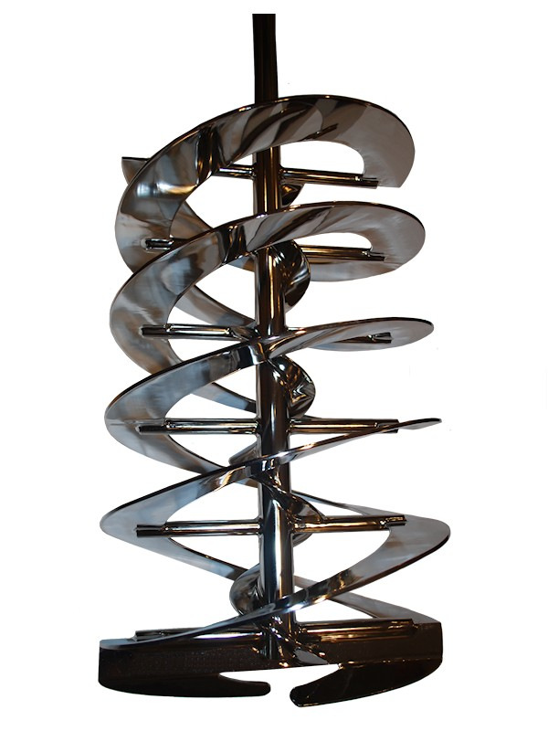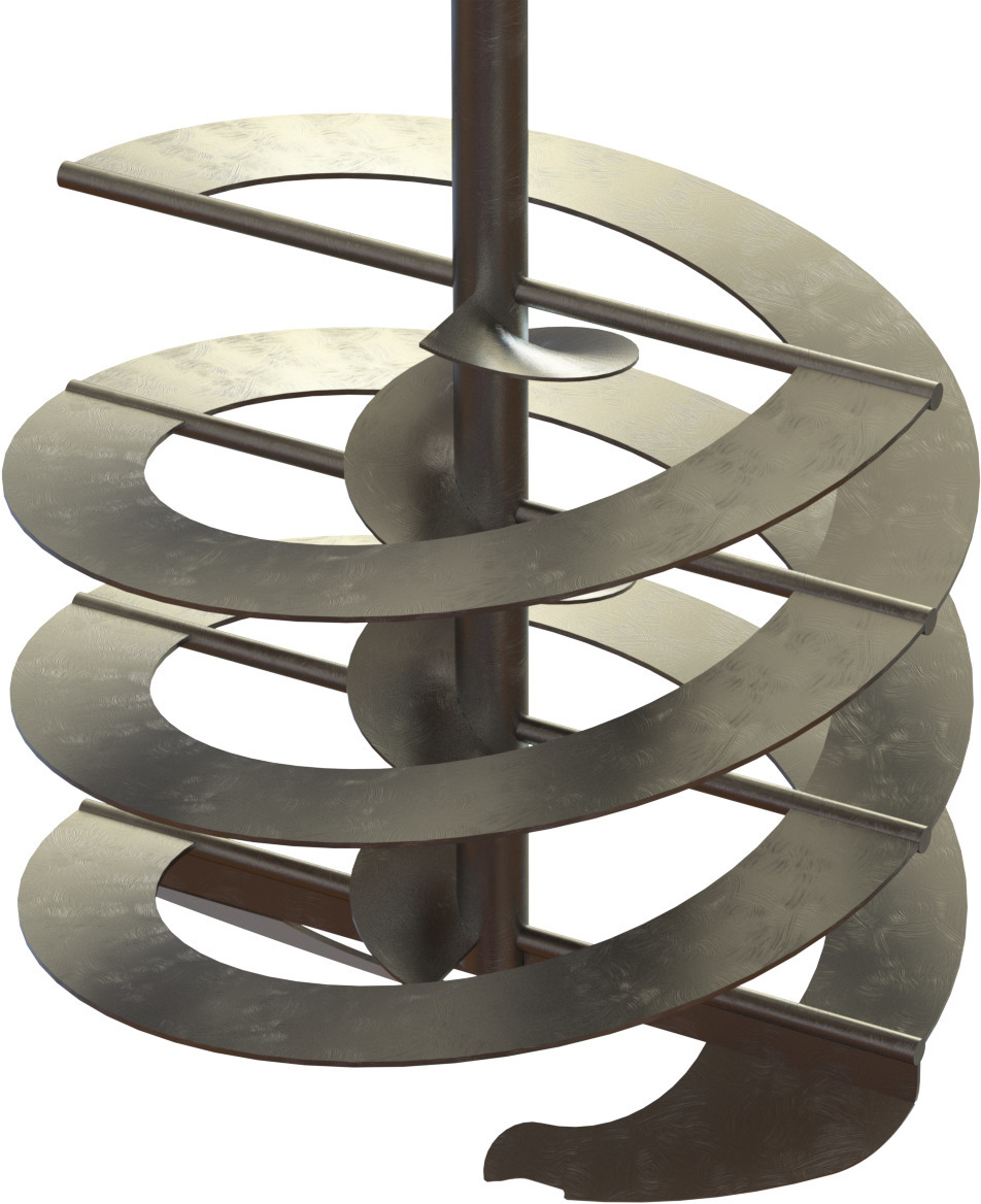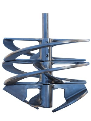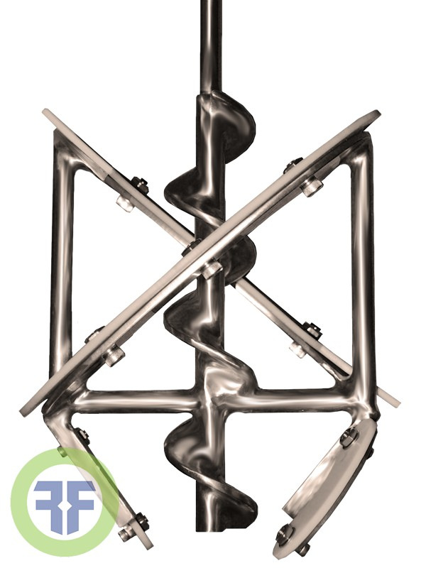 One of the most popular designs associate with low shear high viscosity blending. When viscosity becomes so high that flow is extremely laminar, the helical flighting of the HR2 acts as a fluid conveyor to blend. Popular for blending high viscosity polymers that are shear sensitive. Standard pitch ratio of ½:1, with other pitch ratios available on request. Bottom sweeps can also be added to provide additional fluid motion in tank dish and cone bottoms. Each configuration is custom designed for specific tank geometry, finish, materials, with add on items like bottom blades and fluid driven scrapers (if PS2 is not an option) to meet process requirements.