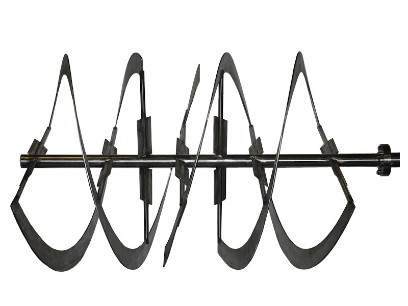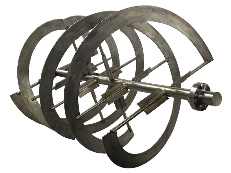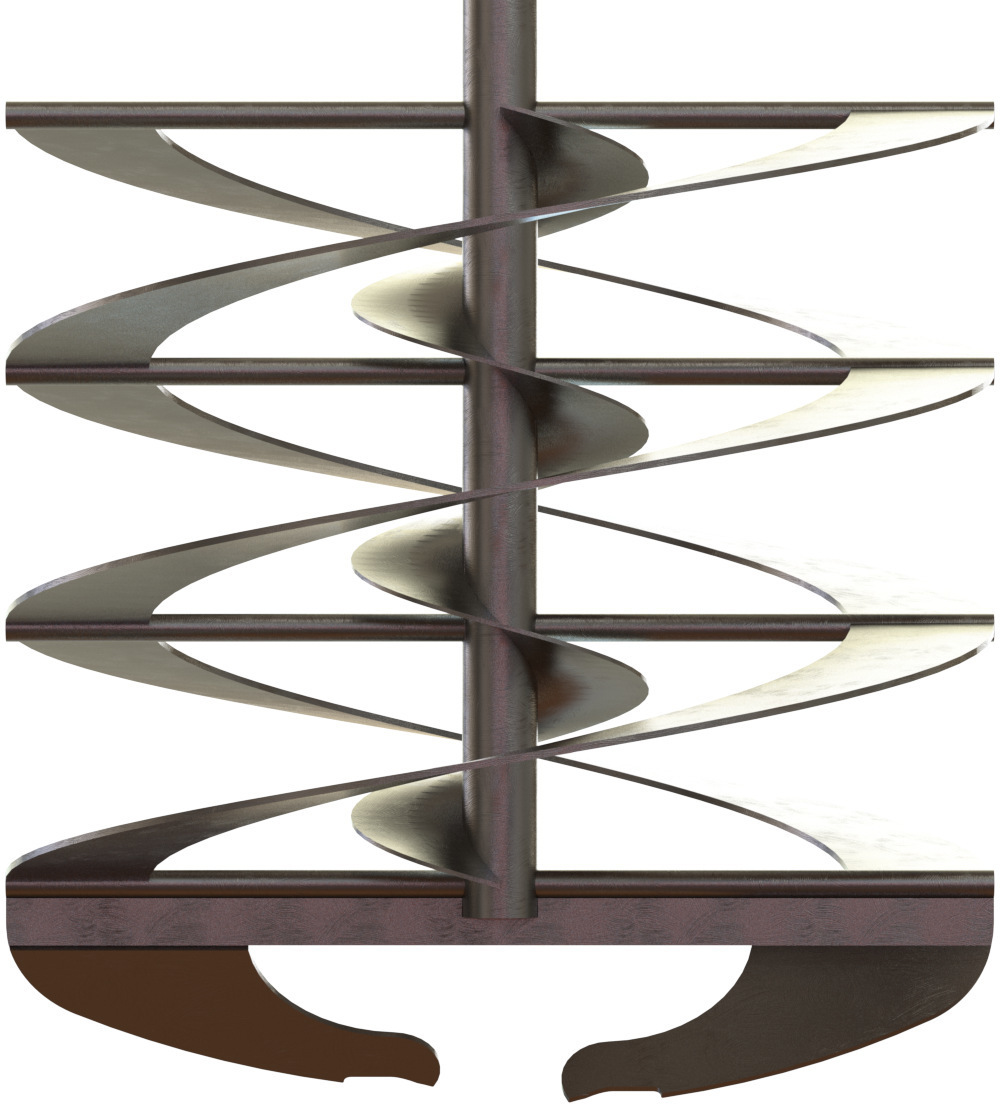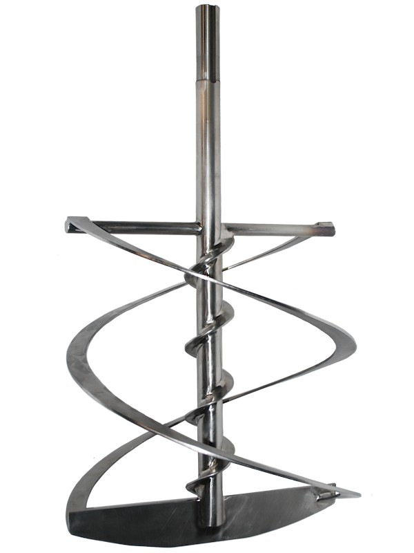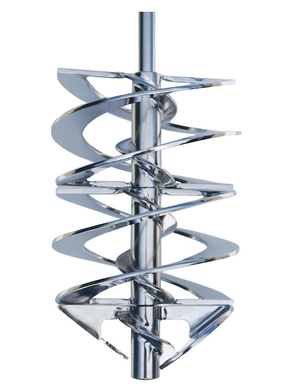 One of the most popular designs associate with low shear high viscosity blending. When viscosity becomes so high that flow is extremely laminar, the helical flighting of the HR2 acts as a fluid conveyor to blend. Popular for blending high viscosity polymers that are shear sensitive. Standard pitch ratio of ½:1, with other pitch ratios available on request. Bottom sweeps can also be added to provide additional fluid motion in tank dish and cone bottoms. Each configuration is custom designed for specific tank geometry, finish, materials, with add on items like bottom blades and fluid driven scrapers (if PS2 is not an option) to meet process requirements.