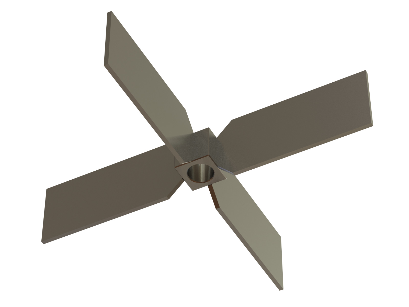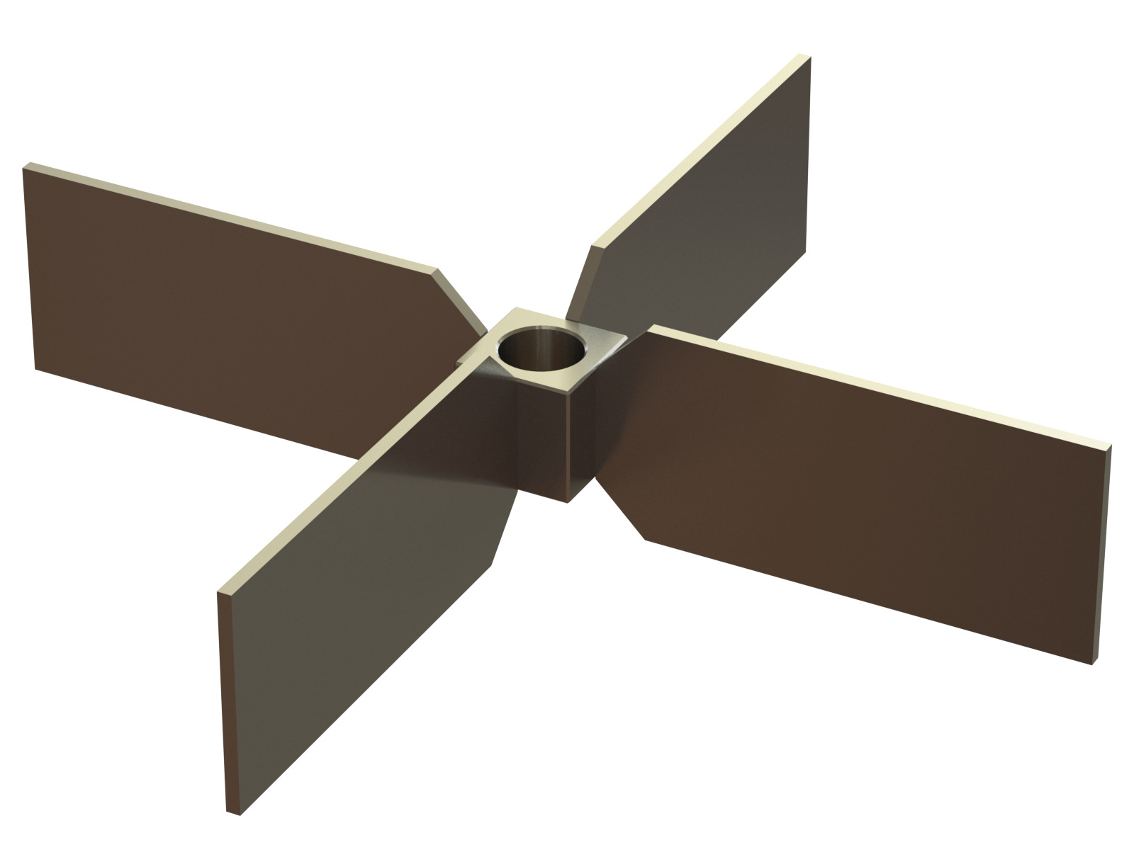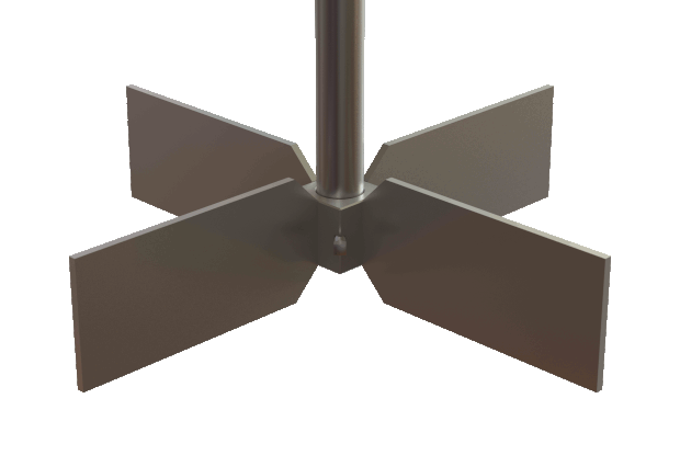 A very simple design with similar proportions to the Pitched Blade Turbine, but with vertical blades. Although not the first choice for most applications, this impeller certainly has a few niche benefits. Unlike the Rushton or Smith, it can run closer to tank bottoms without severe loss in pumping, which makes it great for low level mixing. Additionally, it can be added to the very bottom of the shaft (under an axial flow impeller) to help break up solids settling at the very bottom of the tank in flat bottom tanks. The Radial Turbine is also used in some cases to break up the surface build up in some slurries with floating particles or clumps.