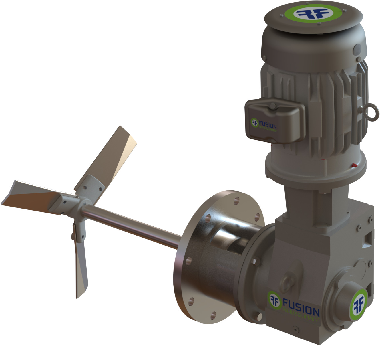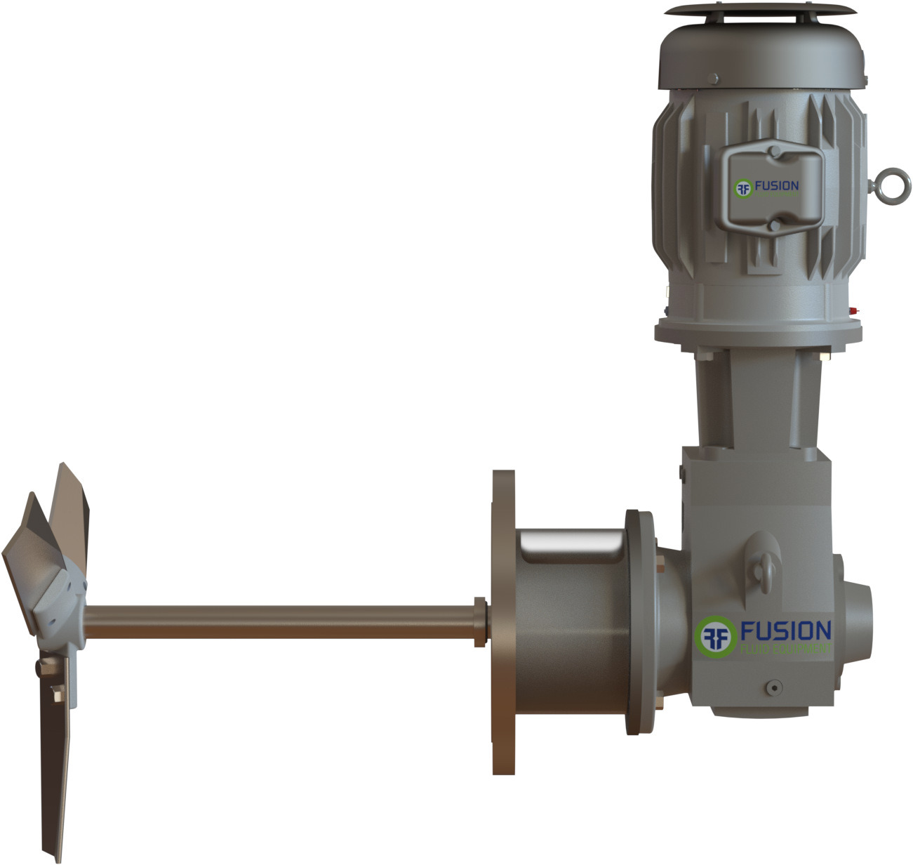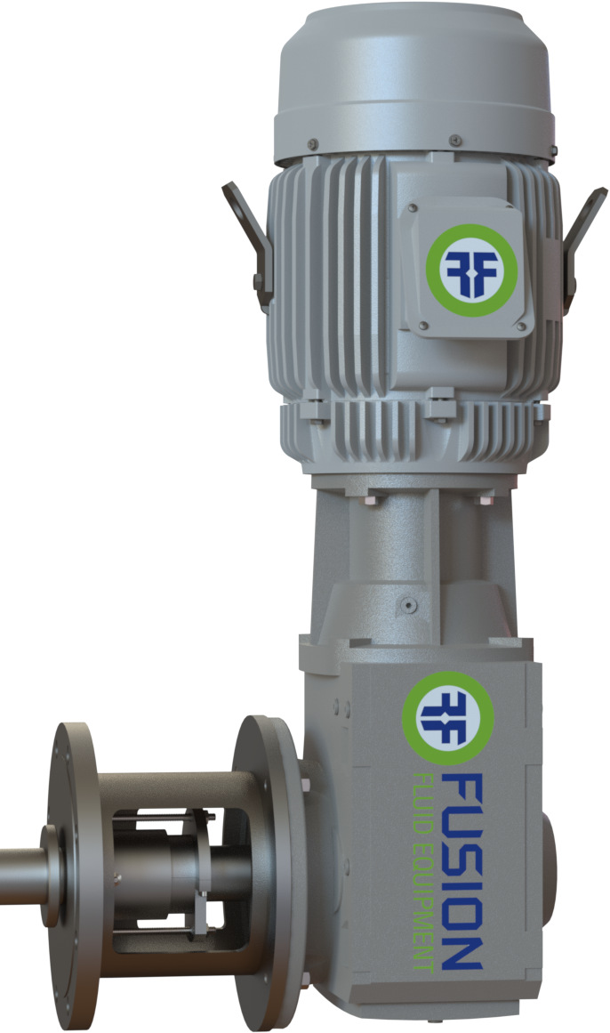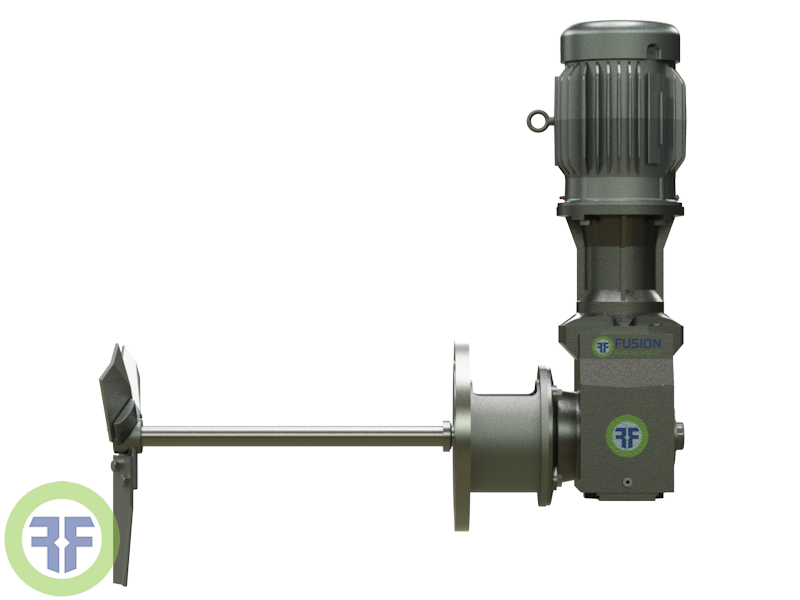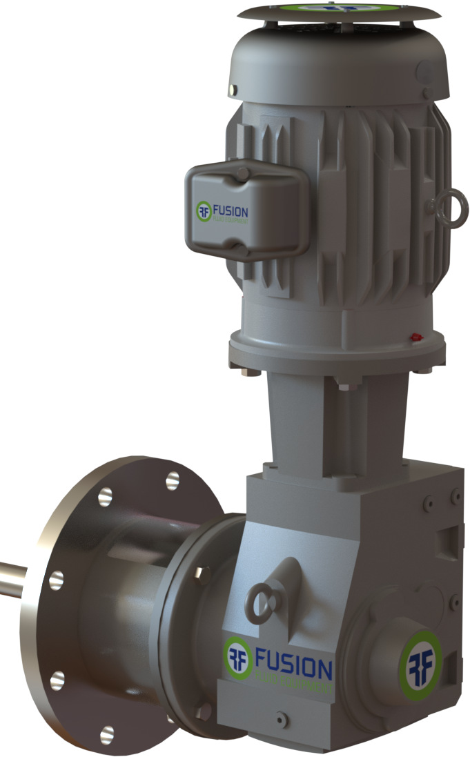 Fusion’s FR3 Series mixer drive is a rugged 3-stage and 4-stage helical/bevel drive built for large scale storage and process tanks. This series is intended for critical applications where reliability is crucial. Additionally, this offers a high torque option for applications where preference for gear drive side entry mixers over belt driven configurations. The RIGHT-ANGLE drive configuration provides an installation with reduced projection from the sidewall of the tank. The high strength housing combined with the high capacity bearings and gearings allow for precise shaft and gear alignment and quiet operation. Fusion’s FR3 series drive also includes a double lip seal with trash guard for superior protection against oil leaks and outside contaminates.